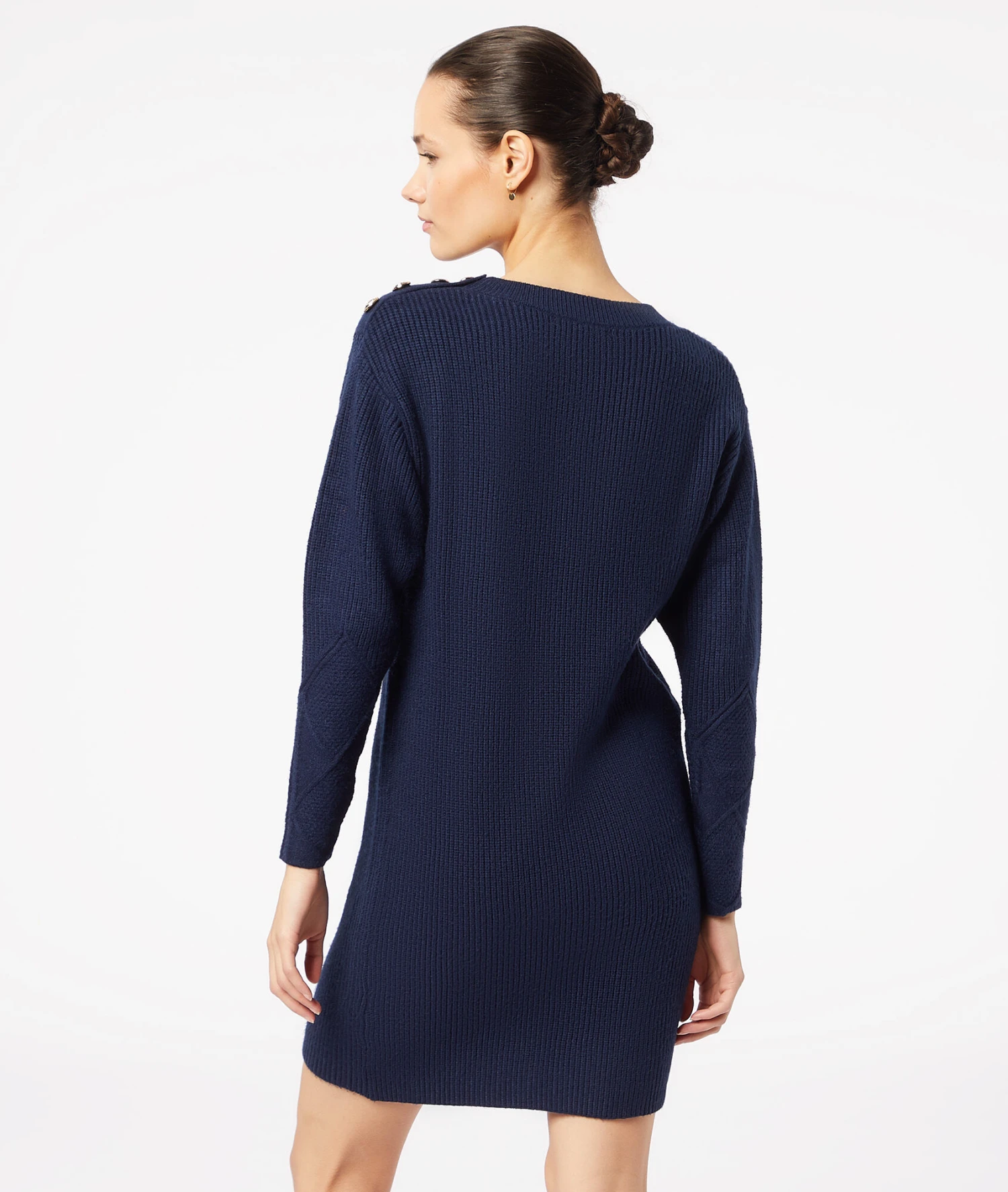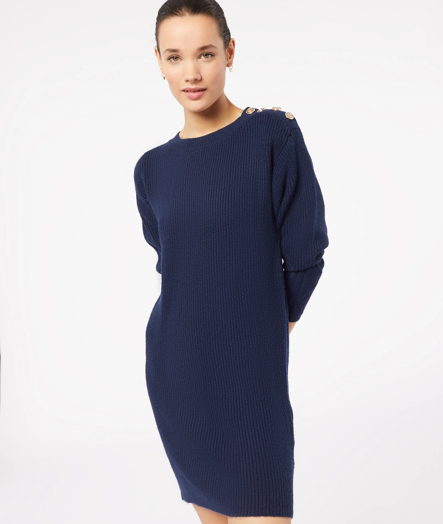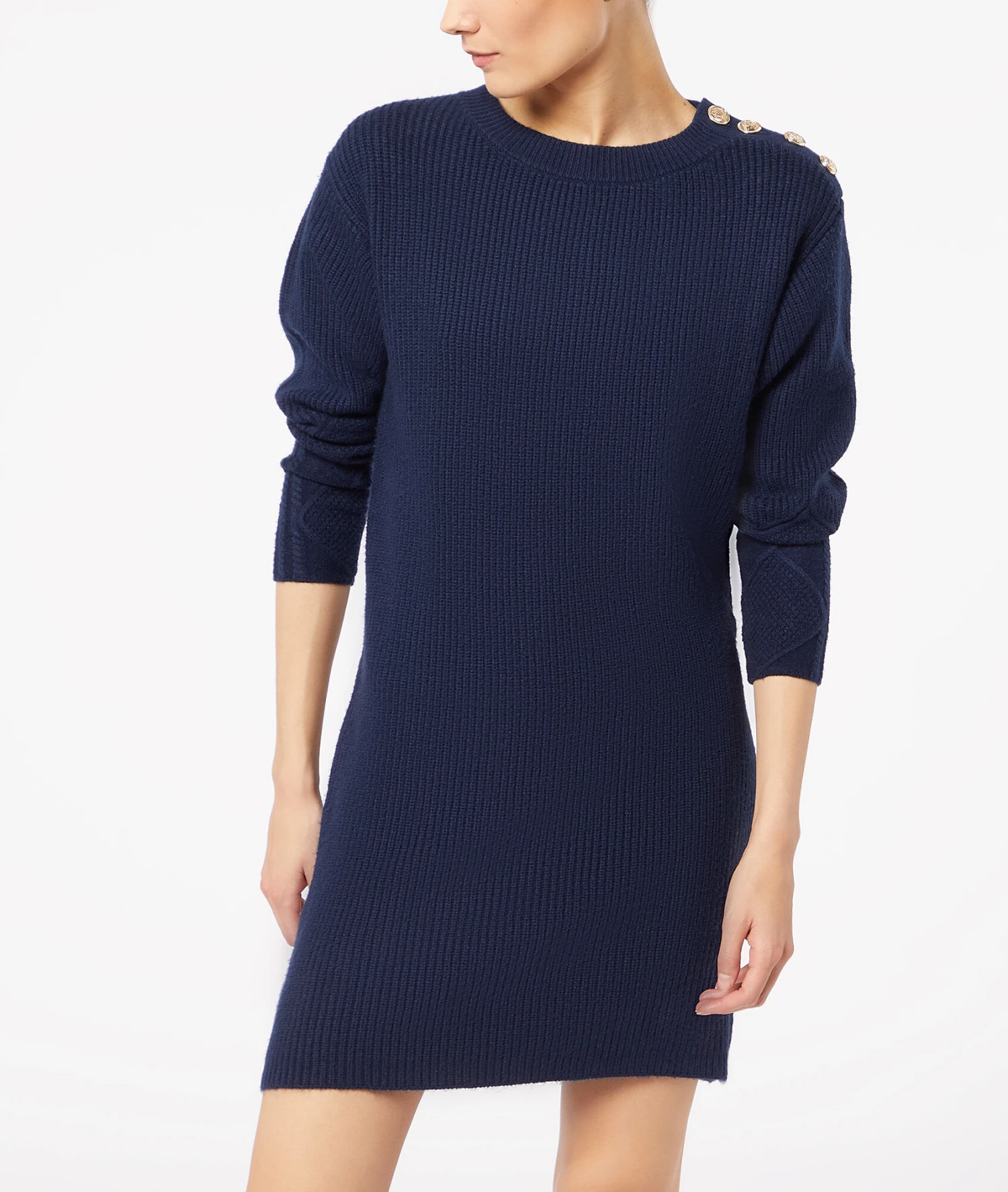 Kleid aus Strick mit rundem Ausschnitt und langen Ärmeln, verziert mit Knöpfen an der Schulter. Tragen Sie es mit Overknee-Stiefeln oder Stiefeletten für einen lässigen/schicken Look.