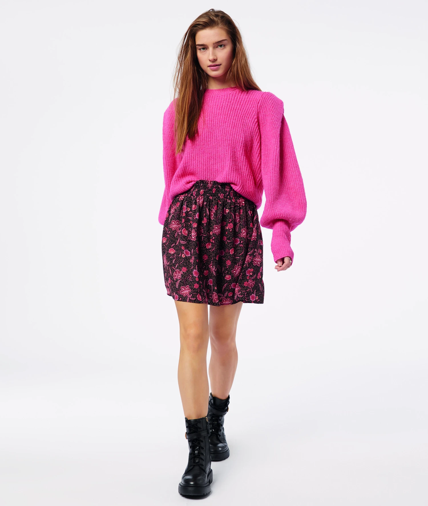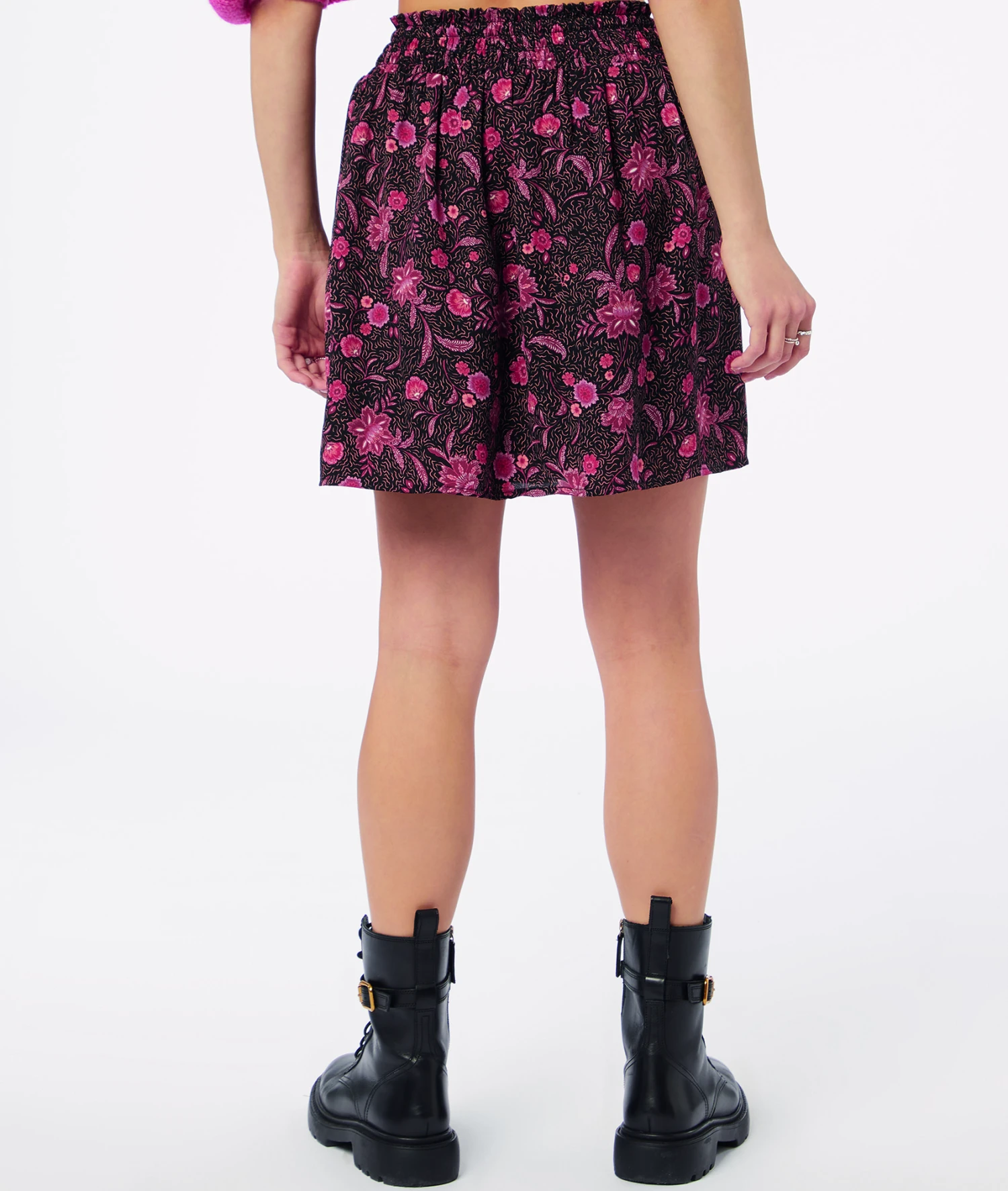 Gesmokter Rock, kurz und ausgestellt – mit betonter Taille und völliger Bewegungsfreiheit dank seiner Leichtigkeit. Mit Stiefeln, einer Hemdbluse und einem kleinen kurzen Mantel für einen formelleren Look.