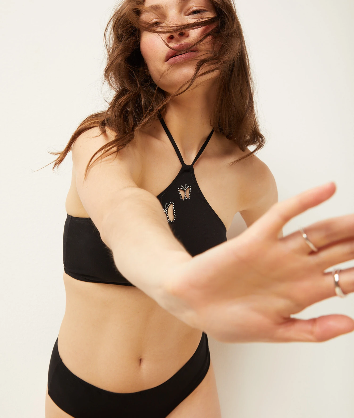 Unser Lieblingsstück für den Sommer! Dieses Bikinioberteil im Stil der 90-er Jahre präsentiert sich in Form eines Bandeaus und wird am Hals gebunden getragen. Ohne Bügel verspricht es unvergleichlichen Komfort und bringt Ihre Formen dezent und in aller Sinnlichkeit zur Geltung. Und das kleine, einfach unwiderstehliche Extra: zwei kleine Cut-outs oben in Form von Schmetterlingen aus Strass, die ein zauberhaftes natürliches Tattoo hinterlassen werden! Perfekt zum passenden Bikiniunterteil oder zu einer Jeans für die angesagtesten Beachpartys.