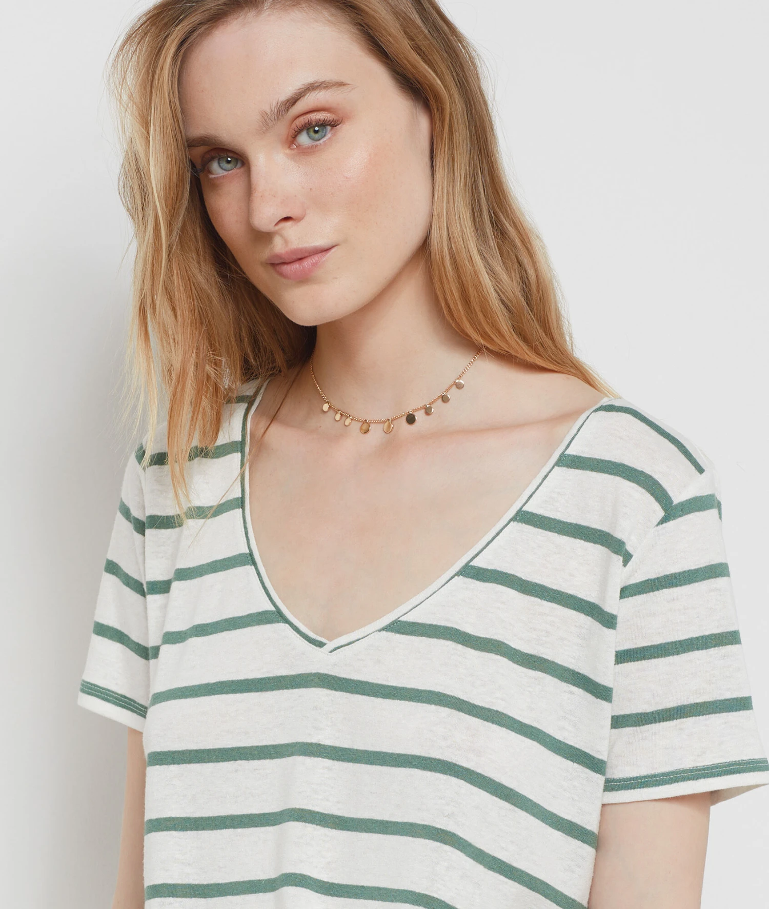 Gestreiftes T-Shirt Aus Leinenmischgewebe KHAKI