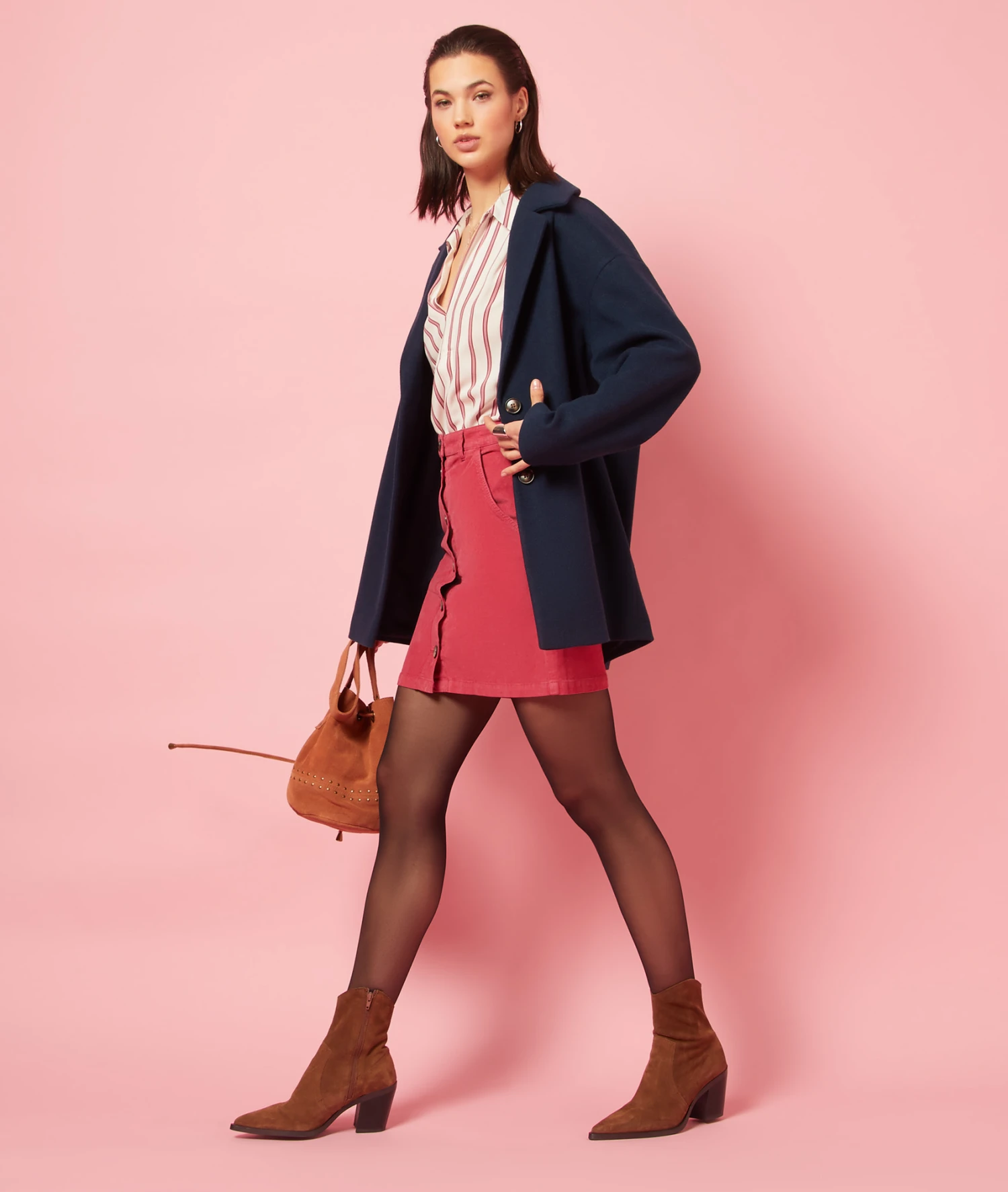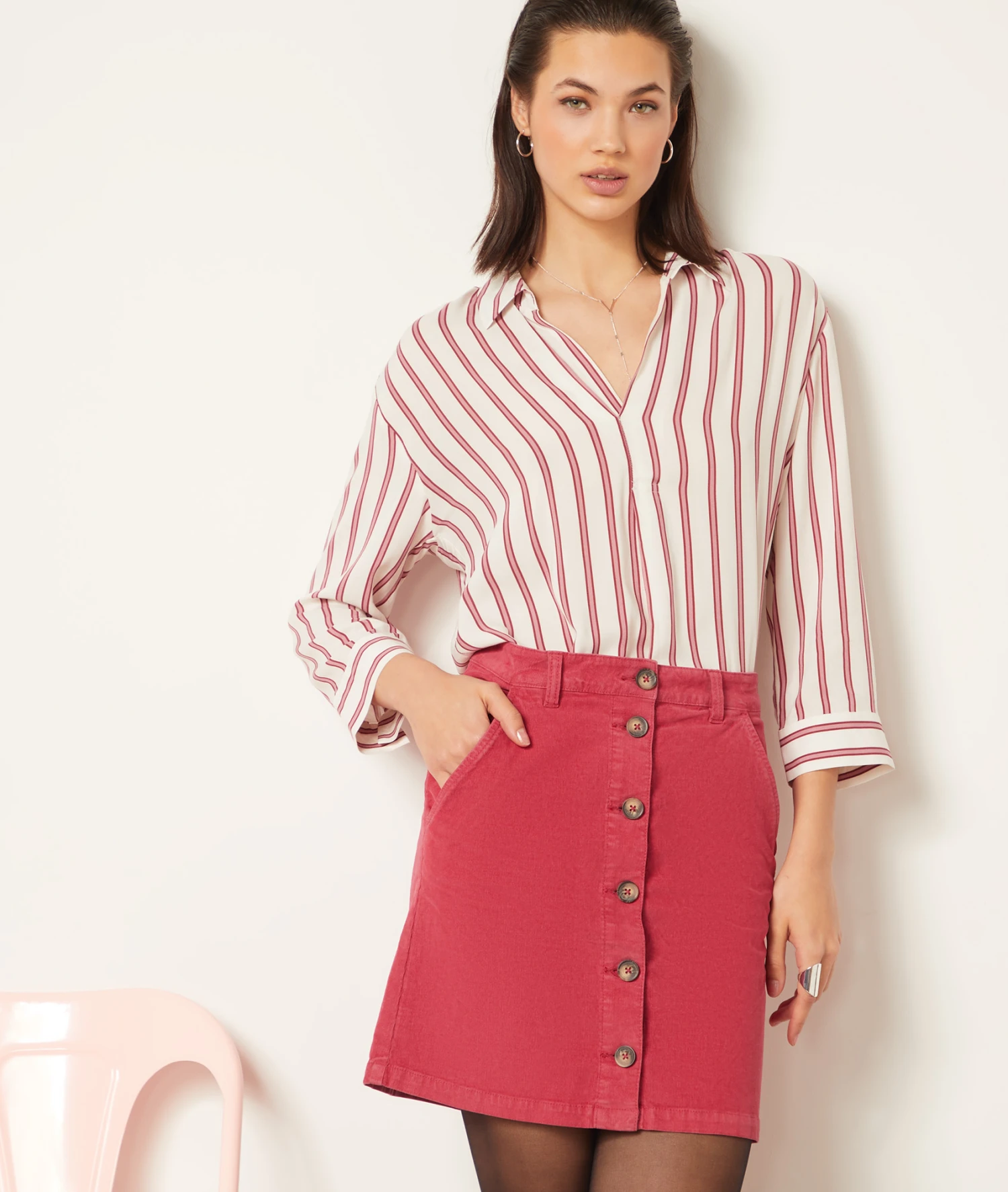 Der immer aktuelle Cordsamt feiert sein Comeback – mit diesem leicht ausgestellten Rock mit kontrastfarbenen Knöpfen. Mit der passenden Jacke ein hübscher Look für den Übergang.