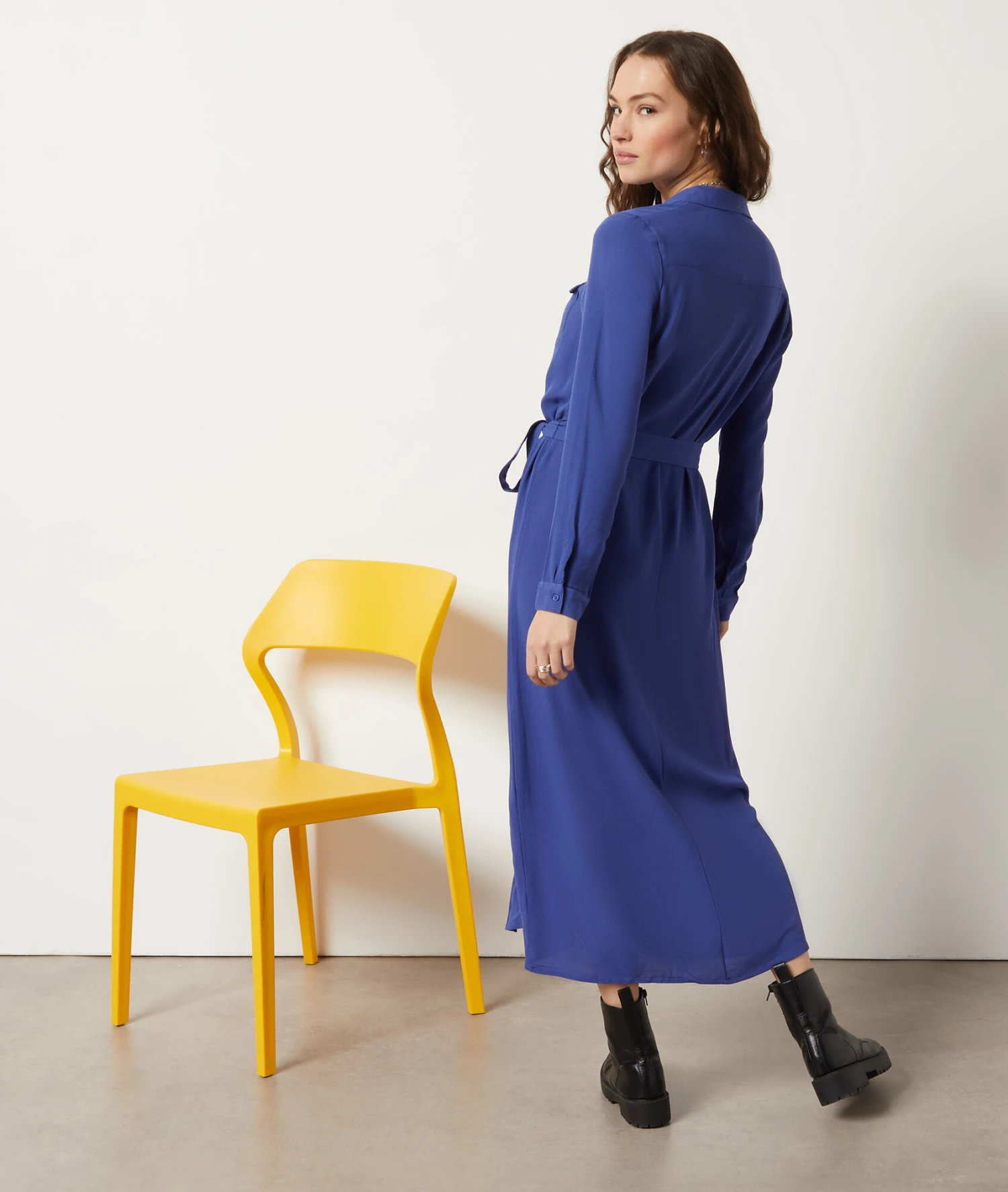 In diesem geknöpften Kleid mit langen Ärmeln und einem Taillengürtel wird die Silhouette dezent betont.